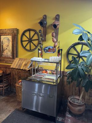 Outside, the patio seating provides an inviting space to enjoy your meal al fresco, where the sound of a gentle water fountain adds to the relaxing environment. With a salsa bar offering various homemade salsas, diners can customize their meals just the way they like them.